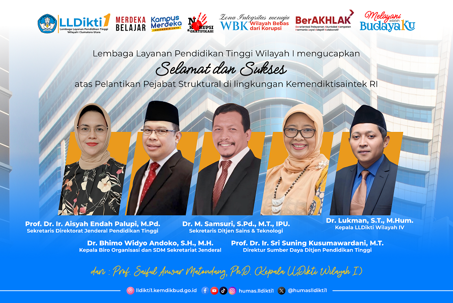 Lembaga Layanan Pendidikan Tinggi Wilayah I mengucapkan Selamat dan Sukses kepada : 1. Prof. Dr. Ir. Aisyah Endah Palupi, M.Pd. (Sekretaris Direktorat Jenderal Pendidikan Tinggi) 2. Dr. Bhimo Widyo Andoko, S.H., M.H. (Kepala Biro Organisasi dan Sumber Daya Manusia) 3. Dr. M. Samsuri, S.Pd., M.T., IPU. (Sekretaris Direktorat Jenderal Sains Dan Teknologi) 4. Prof. Dr. Sri Suning Kusumawardani, S.T., M.T. (Direktur Sumber Daya) 5. Dr. Lukman, S.T., M.Hum. (Kepala Lembaga Layanan Pendidikan